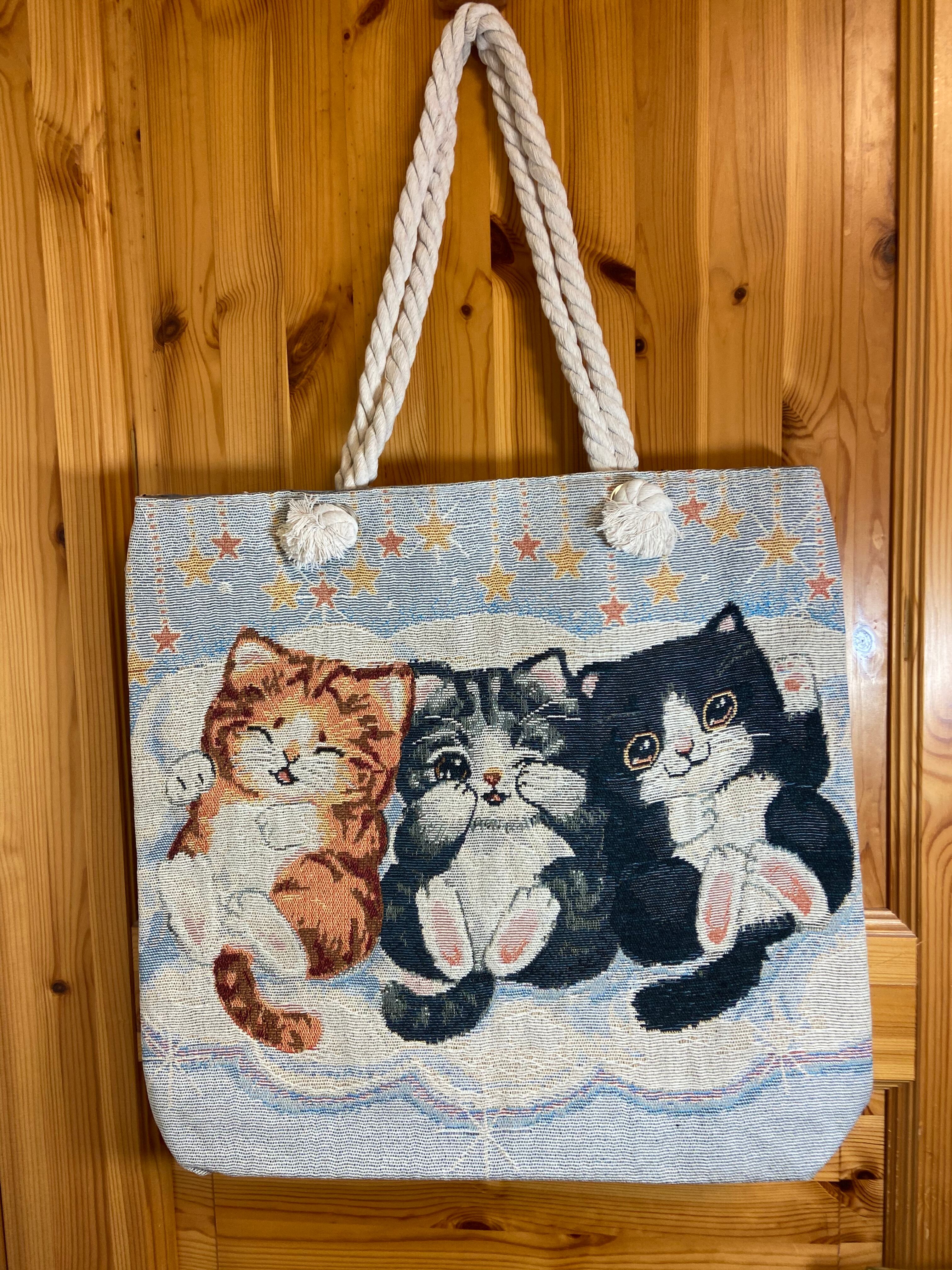 ★お洒落な刺繍のキャンパスバック★ トート ロープ紐 軽くて丈夫 ネコ柄