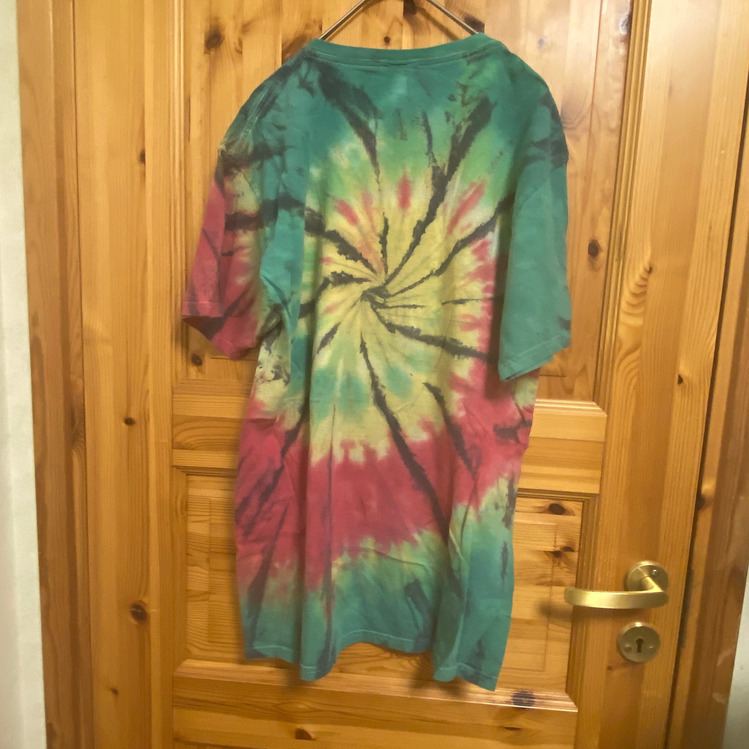 美しいタイダイ柄でまるでアートのような色彩が特徴です。ネコのモチーフは、幸運と富を象徴しており、着るだけでポジティブでハッピーな気持ちになれること間違いなし。ビッグシルエットのデザインは、体のラインをカバーしながらも、おしゃれでスタイリッシュな印象を与えます。とても希少で可愛いデザインのTシャツです。夏フェスにもピッタリ!