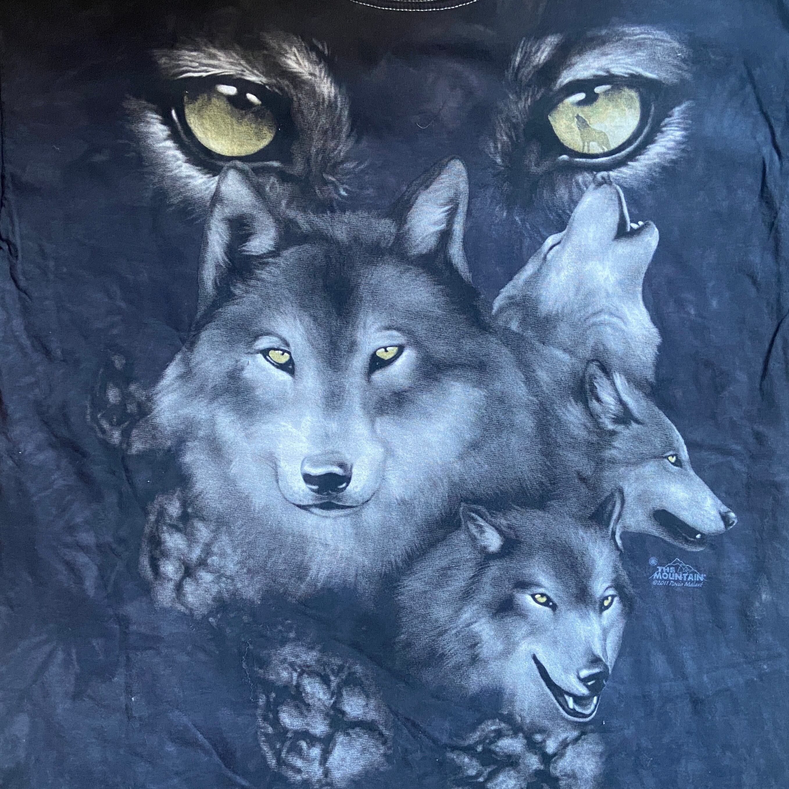 【海外古着】ギルダン ザマウンテン ハイチ製 アニマル デカプリント ブラックタイダイ オオカミいっぱい!